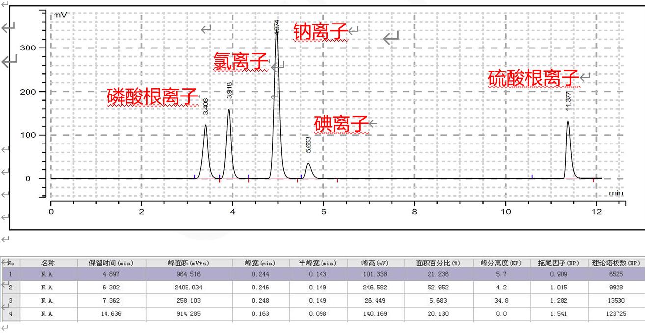 Comixsil ACRP液相色譜柱同時(shí)分離磷酸根離子、氯離子,鈉離子,碘離子和硫酸根離子