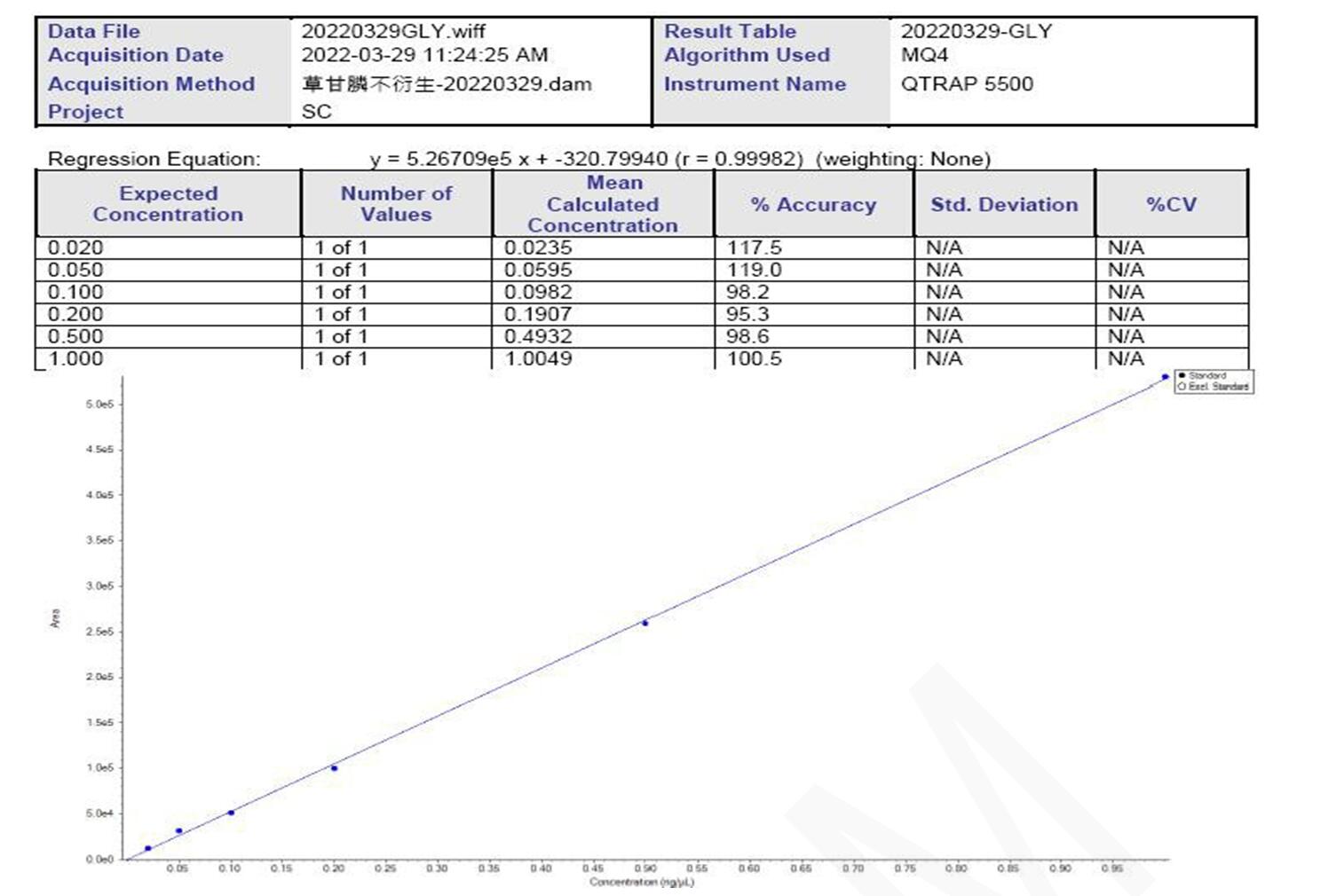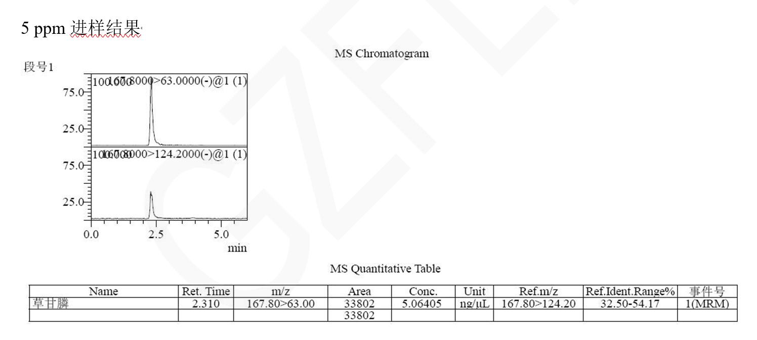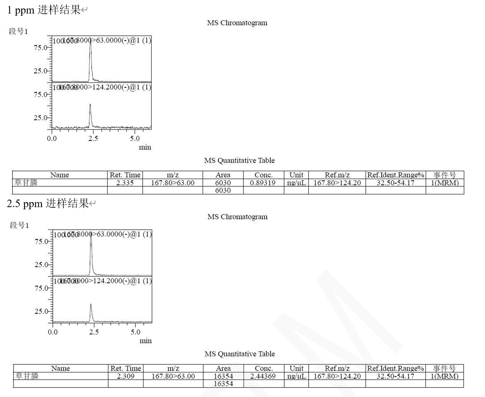 說(shuō)明:本方法研究草甘膦不衍生直接檢測(cè)。相比于傳統(tǒng)衍生后用 C18 分析,或者用氨基柱不衍生 PH=10-11 條件下分析,帶來(lái)的復(fù)雜,耗時(shí),以及氨基柱結(jié)果重現(xiàn)與壽命上的問(wèn)題。此方法簡(jiǎn)單,快速,方便??蓾M足常規(guī)分析檢測(cè)需求以及多數(shù)殘留檢測(cè)需求。