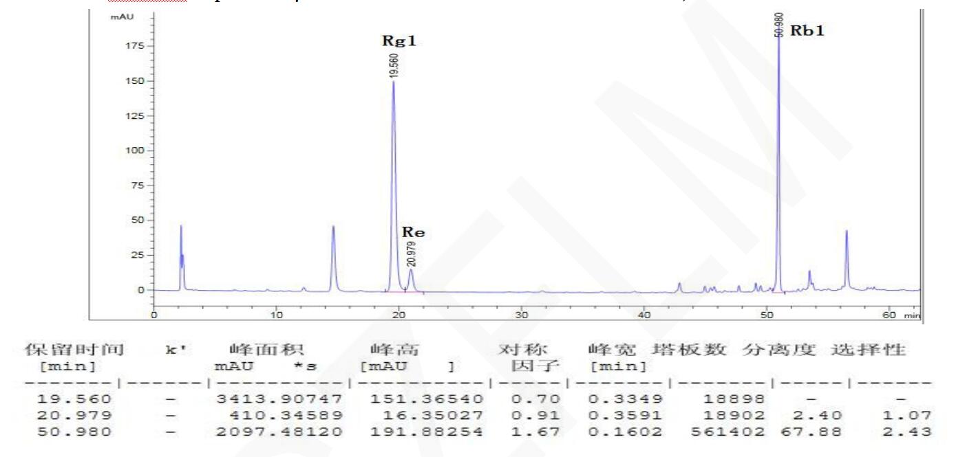 方法說明:使用 FastCore SuperC18 及 FastCore C18-AQ 均可以滿足 Rg1 與 Re 分離度問題,解決了分離度不佳的問題,同時塔板數亦可滿足中國藥典要求。