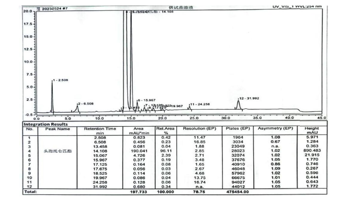 相比其它品牌色譜柱,該柱子有效解決了主峰相鄰雜質(zhì)的分離度,其他色譜柱分離度未達(dá) 1.0,菲羅門色譜柱可達(dá)到 1.5 以上;重現(xiàn)性較好,多次進(jìn)樣均能重現(xiàn),保留時(shí)間較為穩(wěn)定;柱效較高,主成分峰理論板數(shù)可達(dá)到 20000 以上。