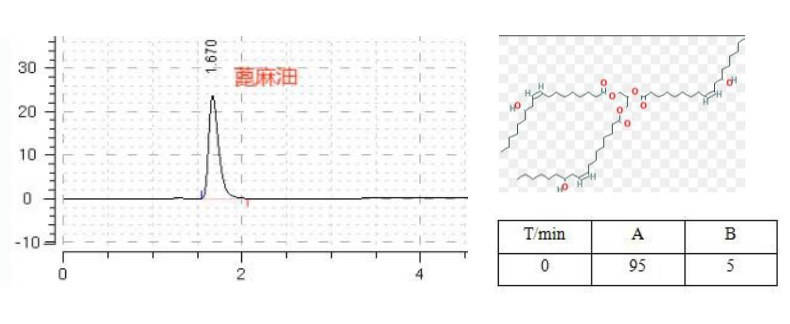 說明:Mercury Tween 色譜柱可用于司盤 20、85 及蓖麻油的檢測,此類物質保留較強,如洗脫能力不足易發(fā)生峰變形。