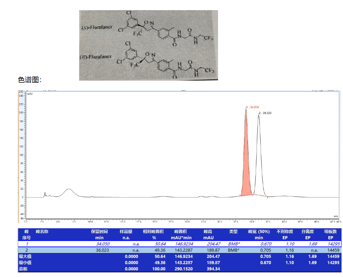 App ID: FLM-B250022 氟雷拉納手性拆分 色譜柱:Chiral MJ(2)-RH 5μ 250*4.6mm( 貨號:FMG-AC5-B03-R) 流動相及色譜條件:咨詢