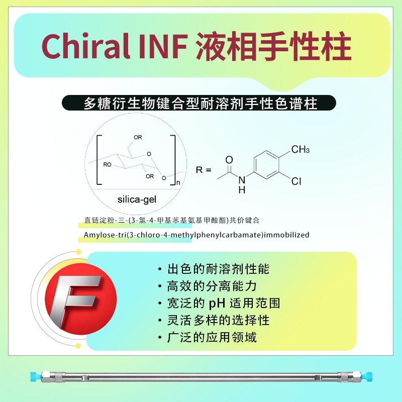 Chiral INF 鍵合型耐溶劑手性柱的固定相為直鏈淀粉-三-(3-氯-4-甲基苯基氨基甲酸酯)共價(jià)鍵合,Amylose-tri(3-chloro-4-methylphenyl 二、使用條件 壓力:為了延長(zhǎng)手性柱的使用壽命,建議保持壓力在30MPa以下。這有助于減少色譜柱的磨損和性能下降。 pH值:該手性柱適用于pH值范圍在2.0至9.0之間的溶液。這提供了廣泛的適用性,適用于多種實(shí)驗(yàn)條件。 溫度:建議在0℃至40℃的溫度范圍內(nèi)使用,以確保色譜柱的穩(wěn)定性和分離效果。 三、可使用的溶劑 Chiral INF 鍵合型耐溶劑手性柱可使用多種溶劑,包括: 正相溶劑:如n-Hexane(正己烷)、IPA(異丙醇)、EtOH(乙醇)等。 特殊流動(dòng)相:如Ethyl acetate(乙酸乙酯)、CH3Cl(氯仿)、THF(四氫呋喃)、MTBE(甲基叔丁基醚)等。 反相溶劑:如H2O(水)、IPA(異丙醇)、MeOH(甲醇)等。 這種廣泛的溶劑適應(yīng)性使得該手性柱在實(shí)驗(yàn)和分析中具有更高的靈活性和適用范圍。 四、產(chǎn)品規(guī)格與訂貨信息 Chiral INF 鍵合型耐溶劑手性柱具有多種規(guī)格,以滿(mǎn)足不同實(shí)驗(yàn)和分析需求。常見(jiàn)的規(guī)格包括不同粒徑(如5μm、3μm等)、不同長(zhǎng)度(如250mm、150mm等)和不同內(nèi)徑(如4.6mm、2.0mm等)的色譜柱。具體訂貨信息: