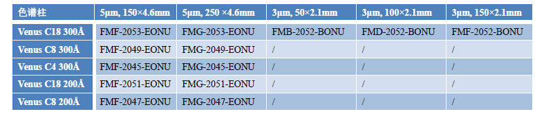 Venus 系列反相色譜柱以超純硅膠為基質(zhì),采用特殊的化學鍵合技術(shù),形成單層ODS,使
